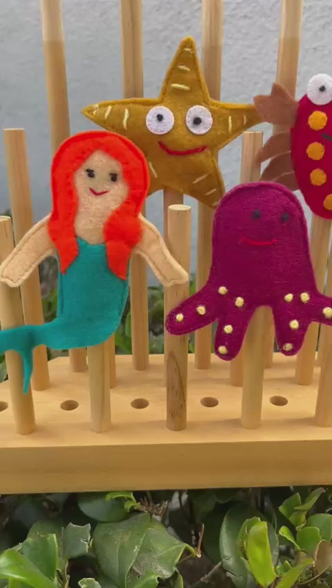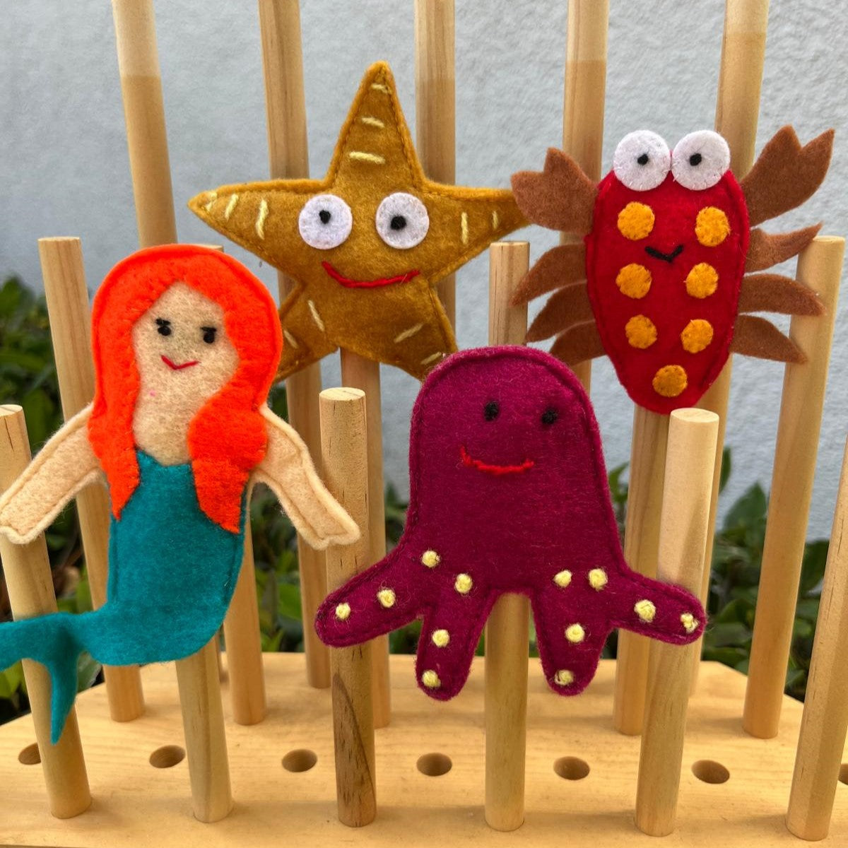 Explore the magic of the ocean with our Under the Sea finger puppet set! This adorable collection includes a mermaid, crab, octopus, and sea star, all intricately hand-embroidered and designed to inspire imaginative play. Perfect for storytelling anytime, these puppets bring endless underwater adventures to life!